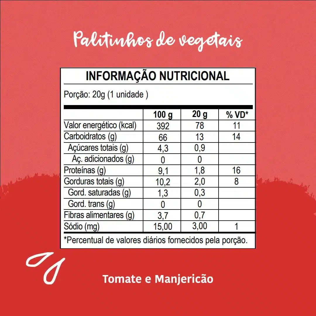 Os Palitinhos de Vegetais são uma opção de lanchinho saudável de verdade para oferecer sem culpa para o seu bebê nos momentos em que precisar! Feitos apenas com ingredientes naturais, repletos de sabor e proteína: uma porção de 20g (equivalente a uma unidade) tem 18% da ingestão diária recomendada de proteínas para crianças de 7 a 11 meses de idade.